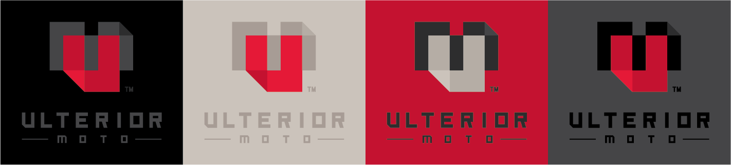 The Ulterior symbol has both vertical and horizontal lockups with the logotype, an outline version, and a flexible color palette. Colors consist of black, red, gray, and warm gray. In all color applications, the "u" has the greatest contrast with the background so it is read first. The "m" and logotype are the second reads. Triangular "folds" give each letter depth and provide movement to keep the eye bouncing back and forth across the symbol. The logotype typeface is custom made from the ground up.